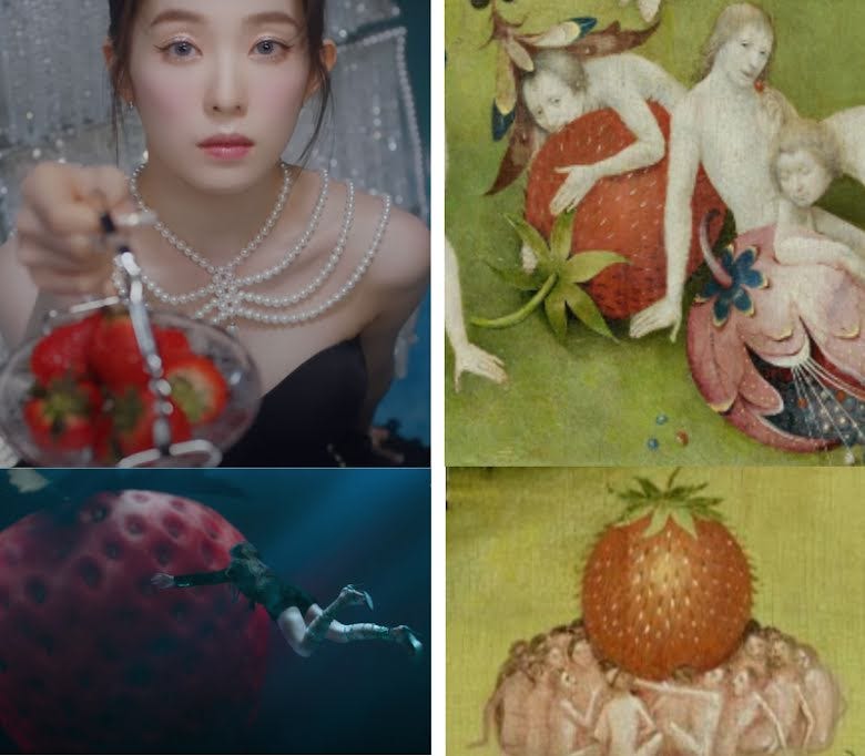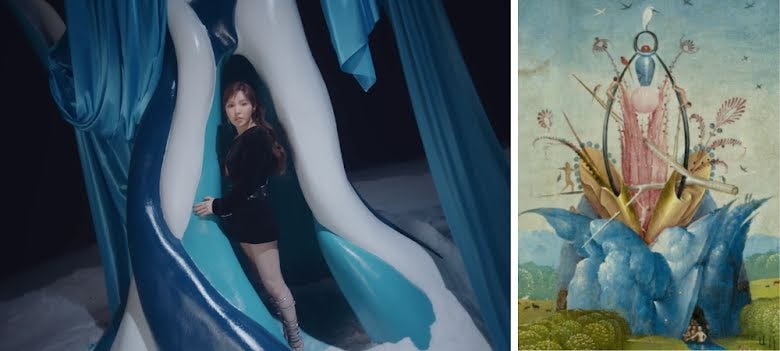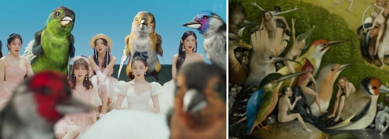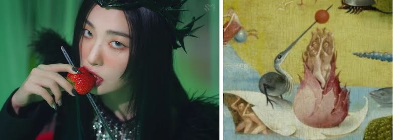 According to the official interview, Irene and Wendy in the MV took on the roles of night and winter, while Joy and Yeri took on the roles of day and spring. Seulgi plays the role of the bystander, going back and forth between the two as an absolute. To clarify, the owl in “The Garden of Earthly Delights” represents the Devil and Seulgi plays the exact same role in the universe of “Feel my Rhythm”. We really don’t have to give meaning to every picture in the MV. Most of them are an homage to the classic masterpieces of European art. What’s important to know is that the story highlights Seulgi as the manipulator and creates the paradox, while the rest of the group remains in the dream.