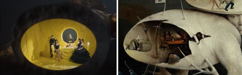 In Bosch’s paintings, the strawberry symbolizes wordly desire and the bird symbolizes wordly pleasure. From the Garden of Eden to the present, the owl has been a bystander watching the sins and destruction of mankind, but when the end of the world comes, it transforms into the role of the judge. Bosch’s paintings depict the world’s greed and pleasure-seeking as leading to ruin and hell, but the MV rejects this interpretetion, expressing that hedonic pursuits lead from cold winter and night to day and spring.